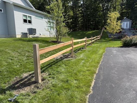A split rail fence is generally made out of split logs and is offered in a number of styles. 2, 3, and 4 rail split rail fences are available. Generally, the type of wood used for split rail fence is Western Red Cedar, but other types are also available. Split Rail fence is typically installed with the bottom rail about a foot and a half off the ground. Some customers decide to staple wire mesh fencing along the fence in order to create more of a barrier, depending on their needs. Split rail posts are installed without concrete to prevent rotting (concrete would hold water against post). Posts are generally spaced ten and a half feet apart.